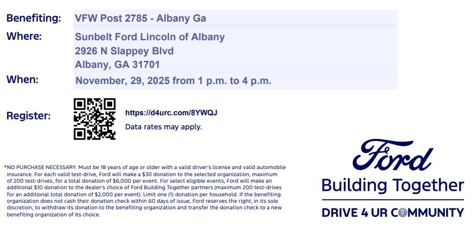 Sunbelt Ford Lincoln of Albany is sponsoring a test drive to raise funds for our Post. Ford will donate $30 for every test-drive, up to $6,000.